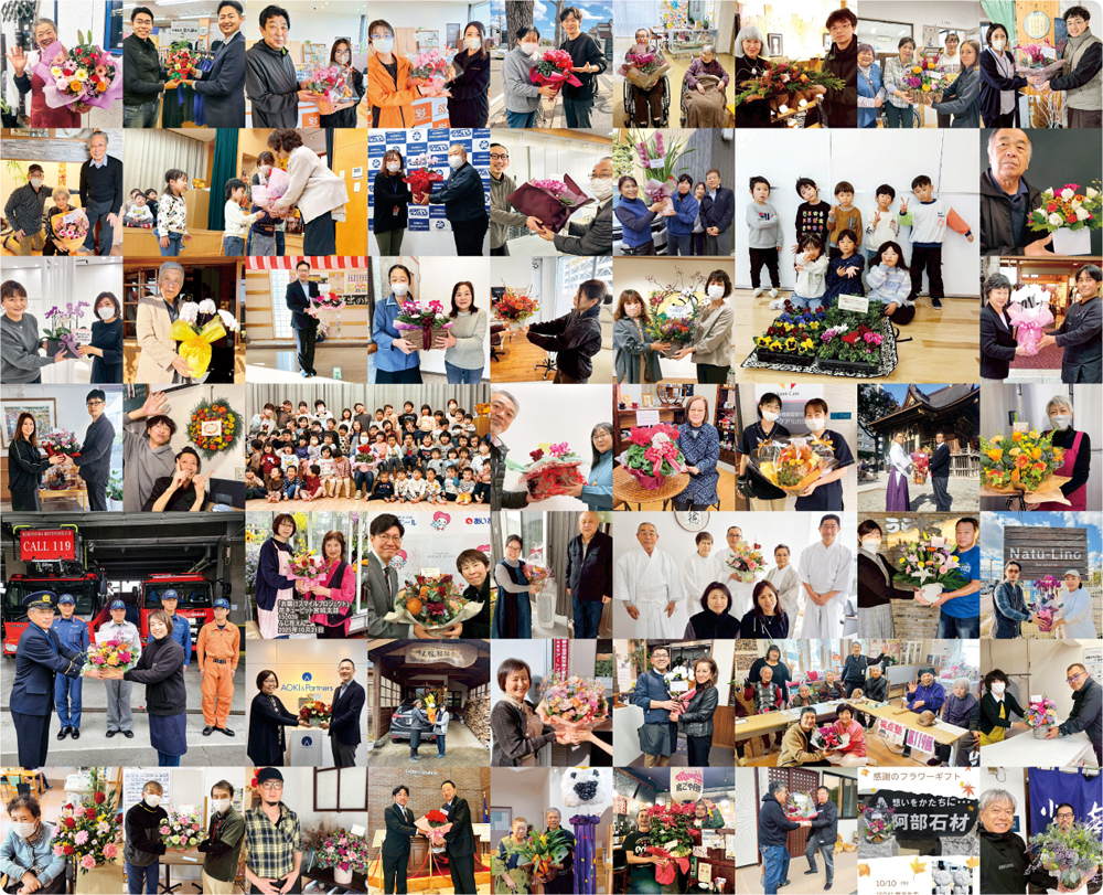 本企画は、地域社会への感謝を伝えるとともに、花を贈ることを通じて人と人のつながりの温かさを感じていただくことを目的として実施いたしました。期間中は、花キューピット宮城支部の各加盟花店より、それぞれの地域の企業、幼稚園、介護施設、神社、高等学校、消防署などへフラワーギフトを贈呈いたしました。